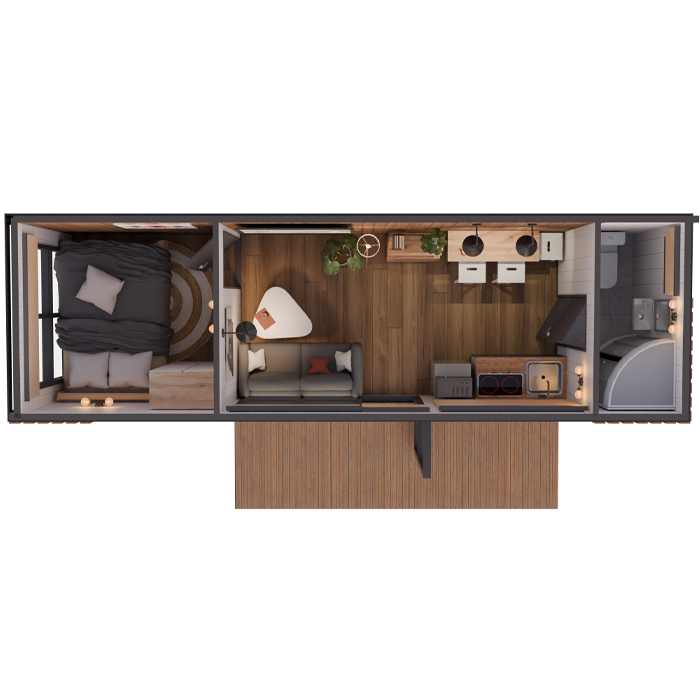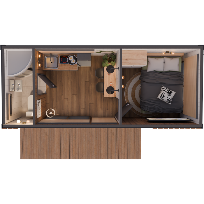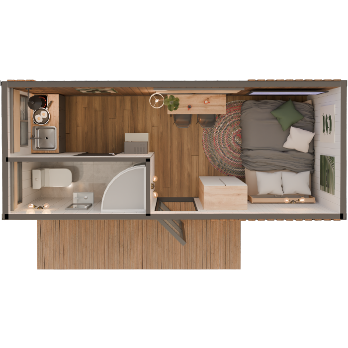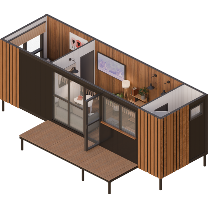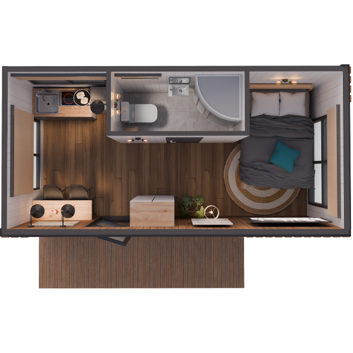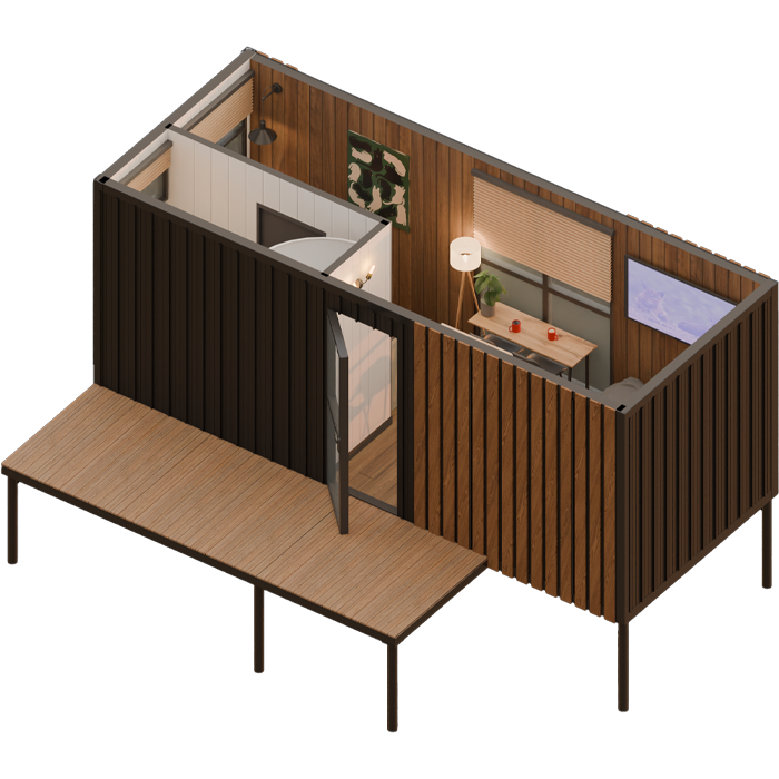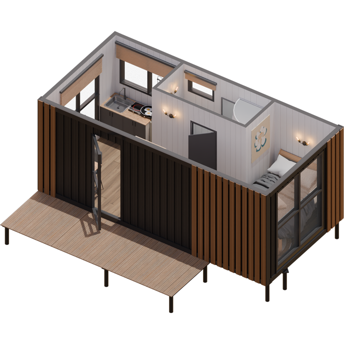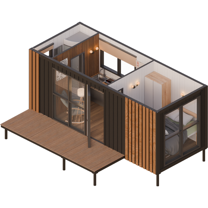 Дом не требует фундамента и подходит даже для сложных ландшафтов.